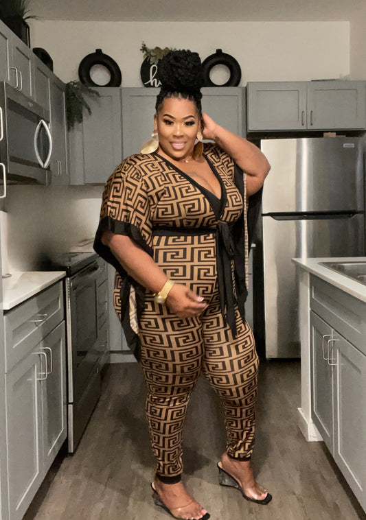 BLACK/BROWN MAZE PRINTED FLARE SLEEVE JUMPSUIT W/BELT