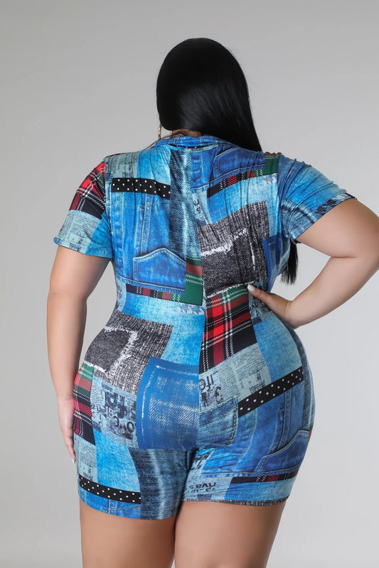 PLUS SIZE Denim Print 2pc Chiffon Collar Button Up Top & skirt Set-50