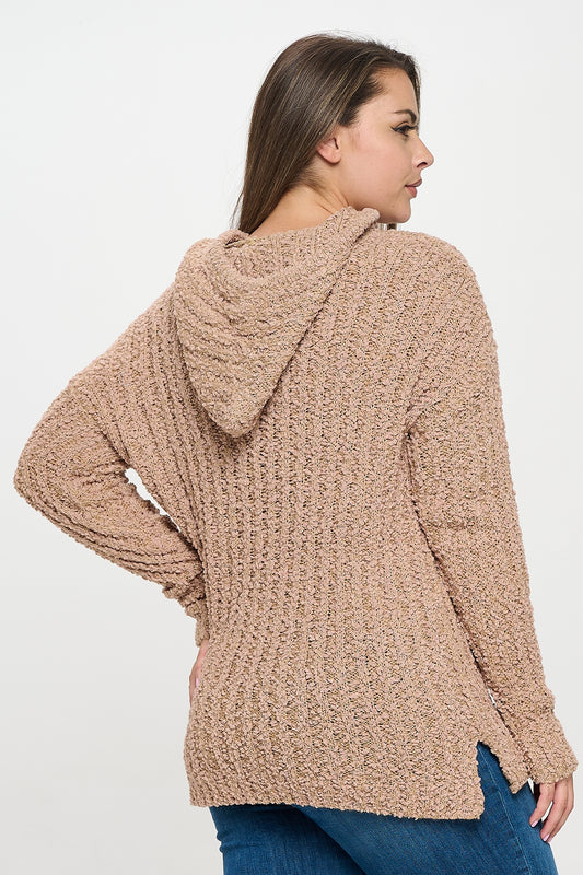 PLUS SIZE POPCORN TUNIC HOODIED SWEATER -TAUPE-BX3