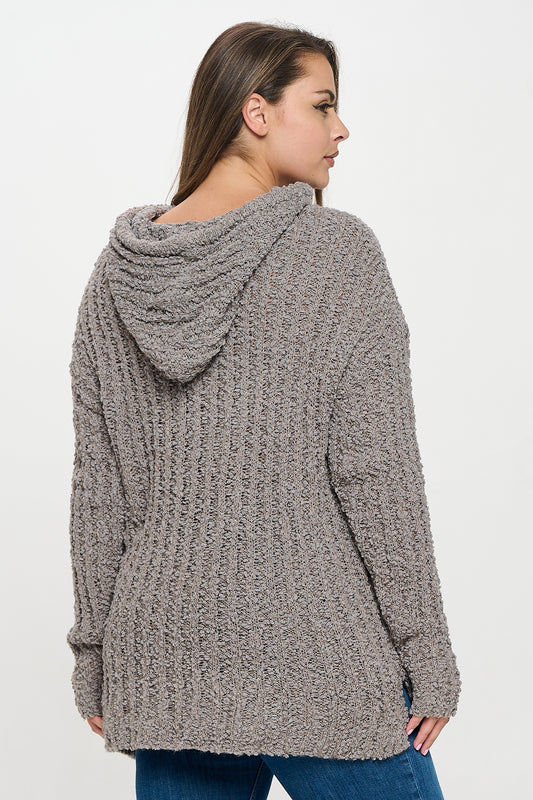 PLUS SIZE POPCORN TUNIC HOODIED SWEATER -GREY-BX3