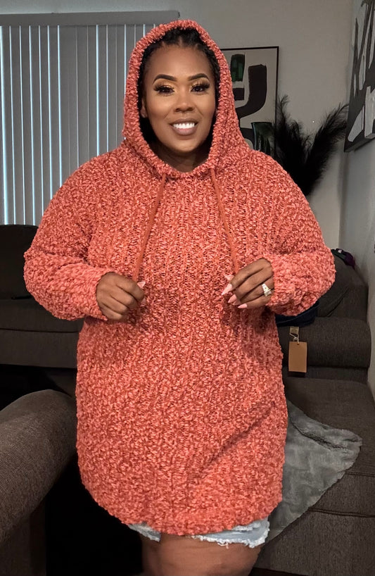 PLUS SIZE POPCORN TUNIC HOODIED SWEATER -RUST-BX3