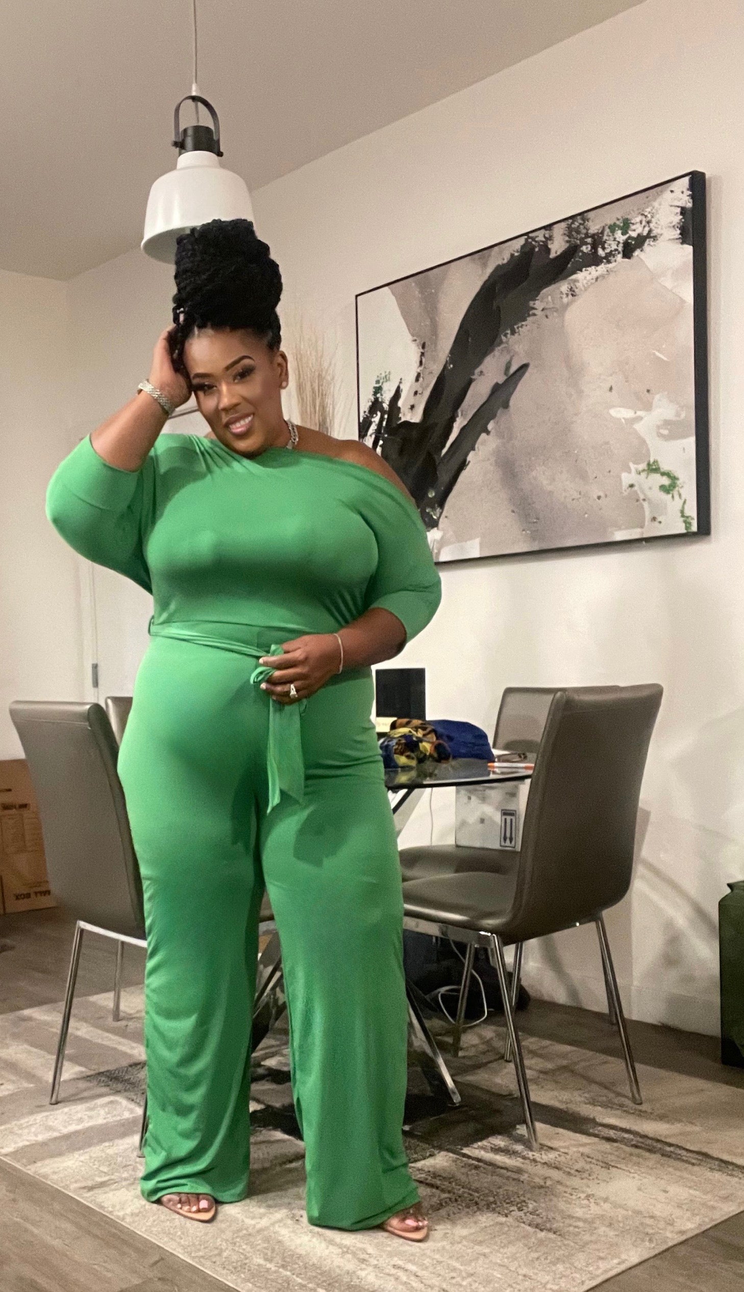 PLUS SIZE WIDE LEG JUMPSUIT W/BELT-GREEN